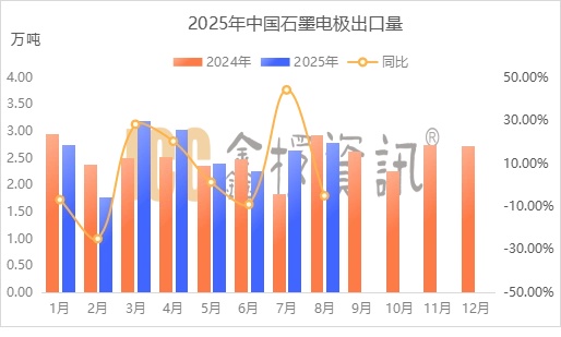 據(jù)海關(guān)數(shù)據(jù)顯示,2025年8月份出口總量為2.79萬噸,環(huán)比增加5.42%,同比減少5.11%。從2025 年1-8 月累計(jì)數(shù)據(jù)來看,石墨電極出口量為20.83萬噸,較去年同期增長4.33%,整體出口態(tài)勢雖月度有波動,但年度累計(jì)仍保持增長。